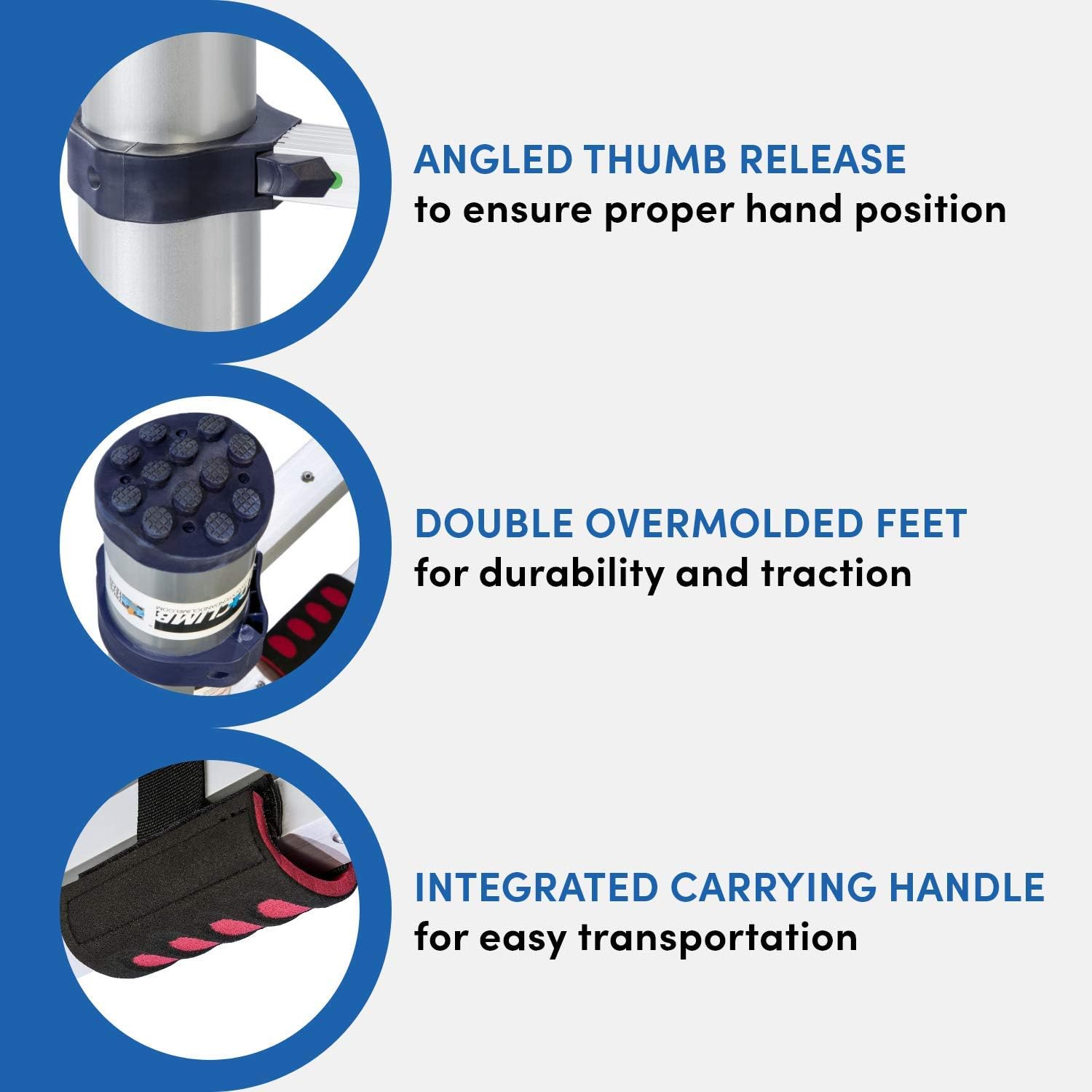 No-Pinch Closure System & Locking Tabs – Designs to protect fingers during retraction, plus visual indicators (green/red tabs) to show when rungs are securely locked.